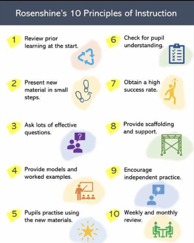 Our pedagogy - defined simply as the method, and practice, of teaching, is based on Rosenshine's Principles. This consists largely of 10 key elements;