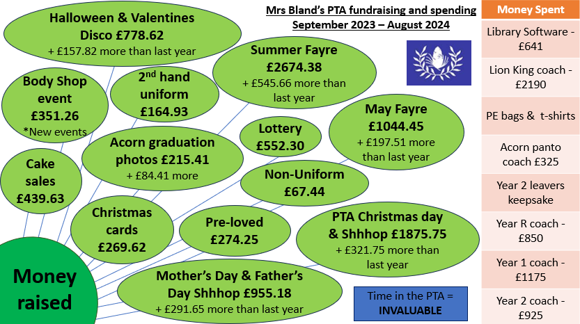 Here you can see how much money the PTA raised for Mrs Bland's last year and how it was spent: